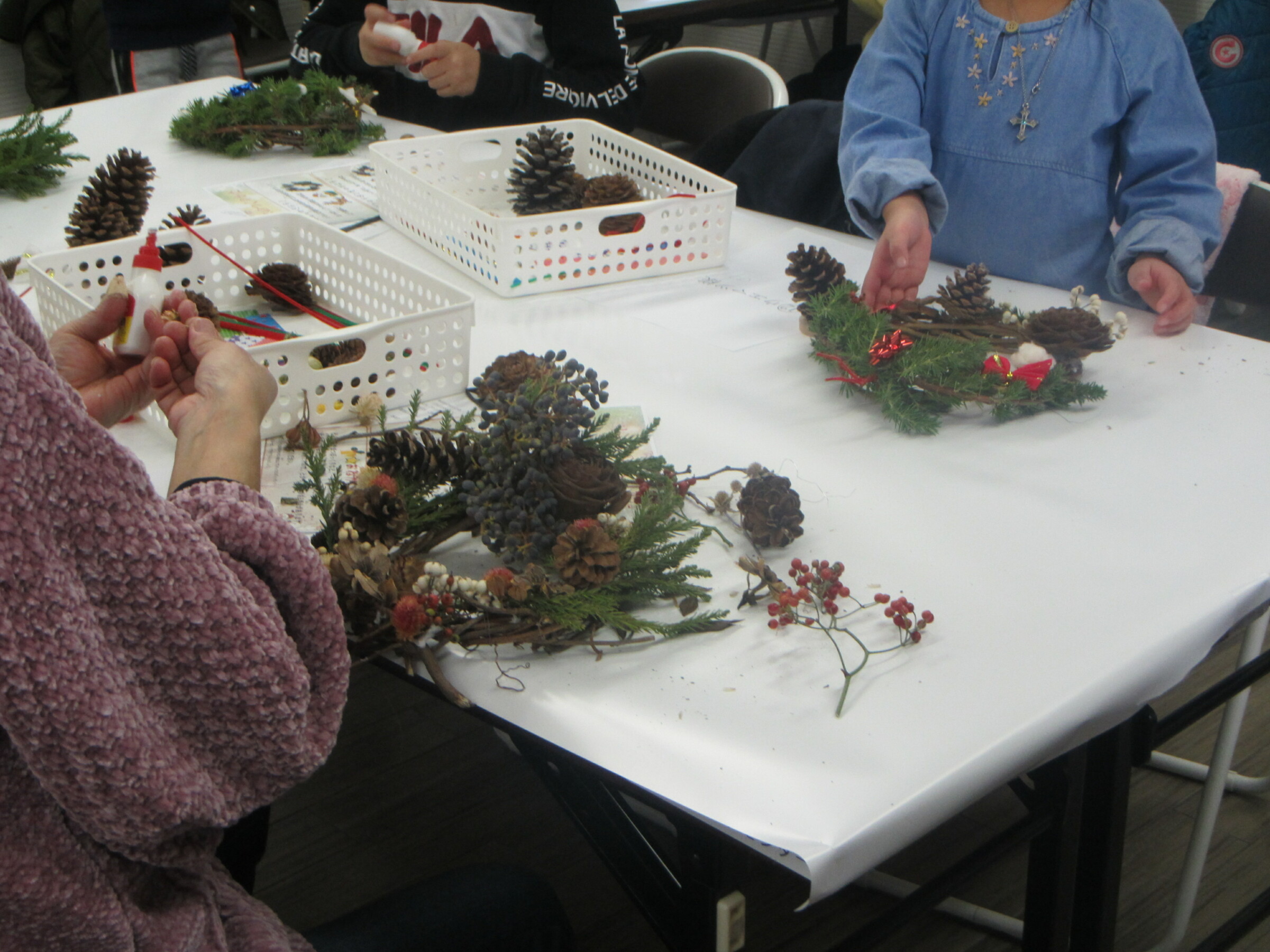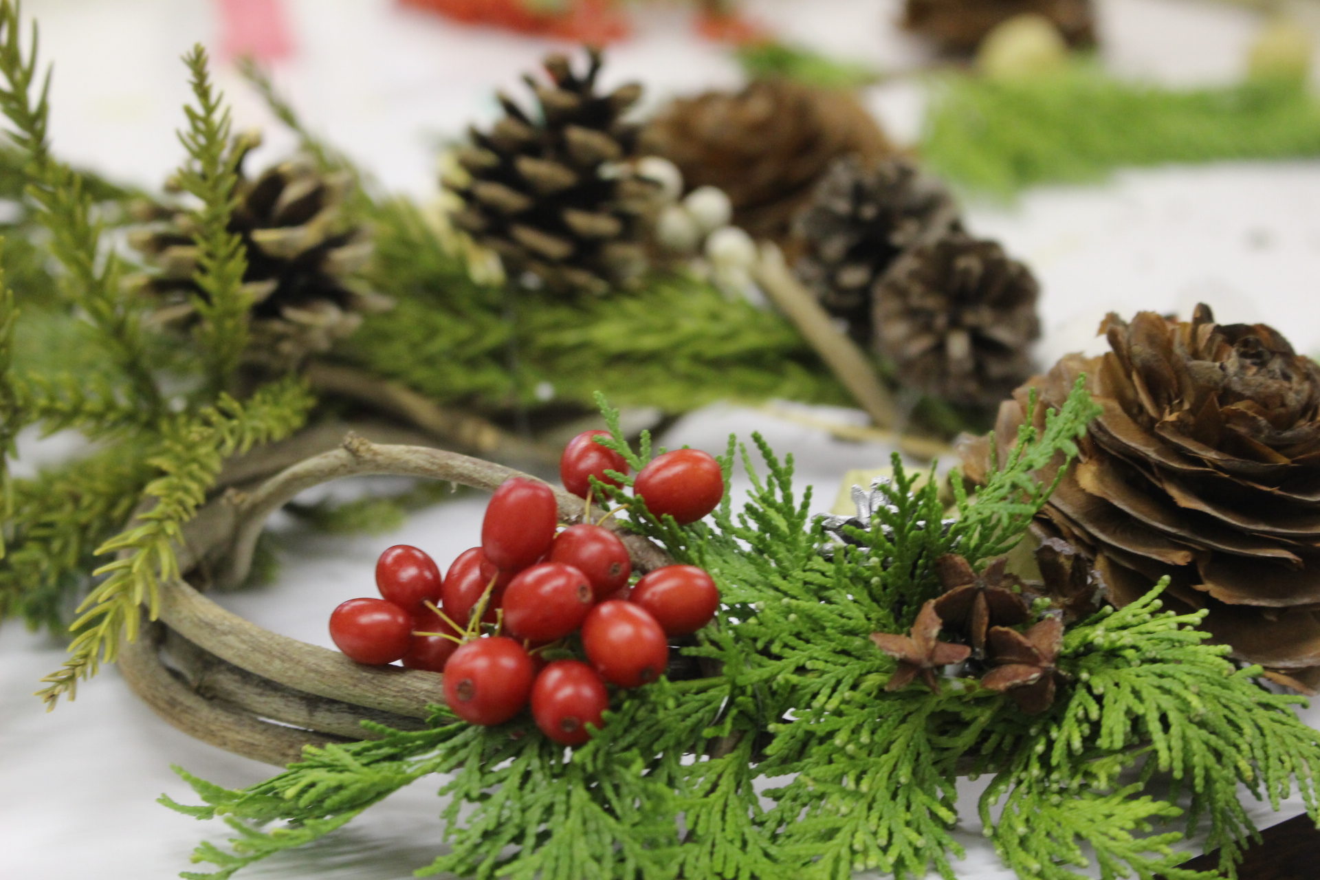 リースの土台に鶴見緑地で採れた木の実やお花をつけてオリジナルのクリスマスリースをつくろう!