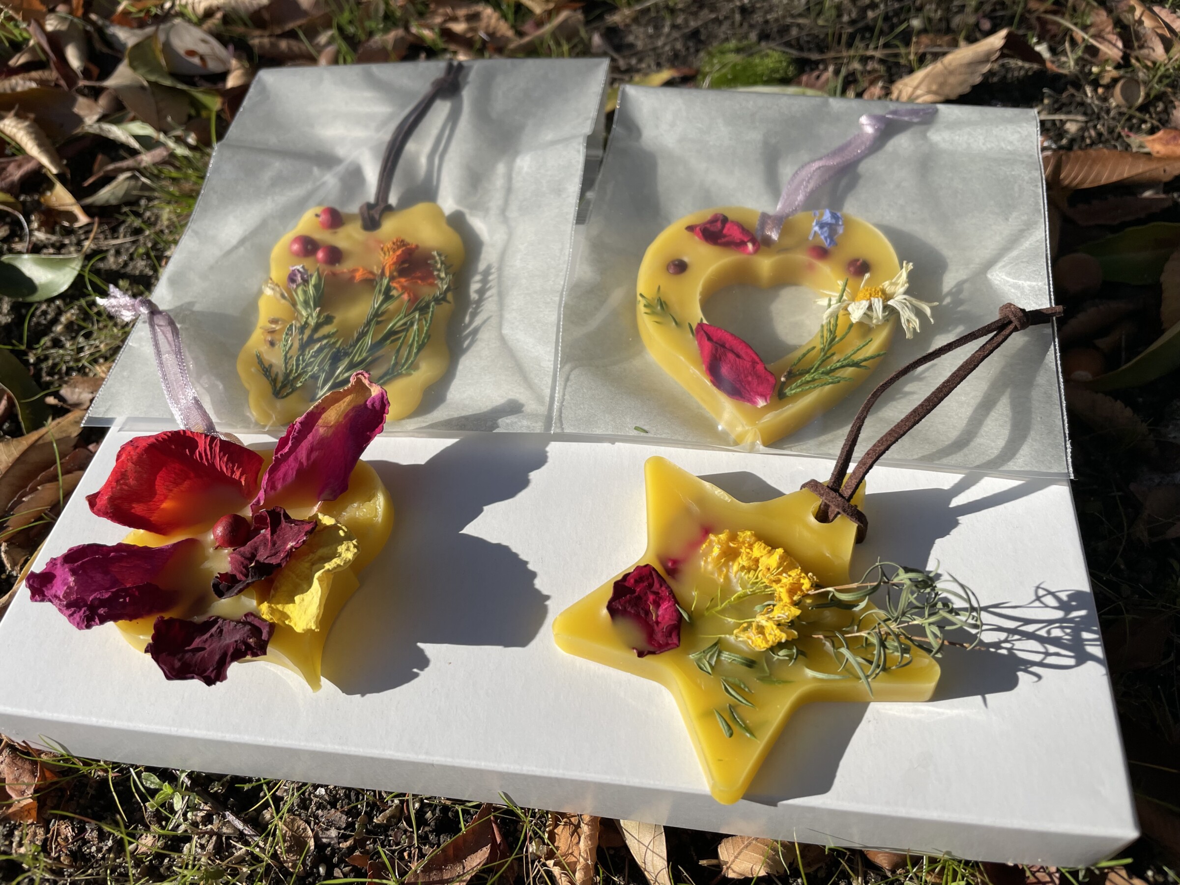 鶴見緑地で採れた蜜蝋と、園内の樹木や草花で作ったドライフラワーを使ったルームフレグランス(アロマワックスバーサシェ)作り。