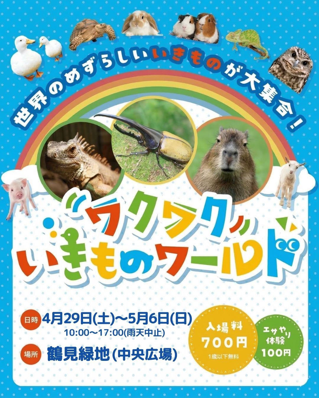今年の春も「ワクワクいきものワールド」が鶴見緑地にやってきます! カピバラ、ウサギ、ヤギ、ブタ、モルモットなどのかわいい小動物、イグアナ、カメレオン、大きなリクガメなどのかっこいい爬虫類、さらに子ど...
